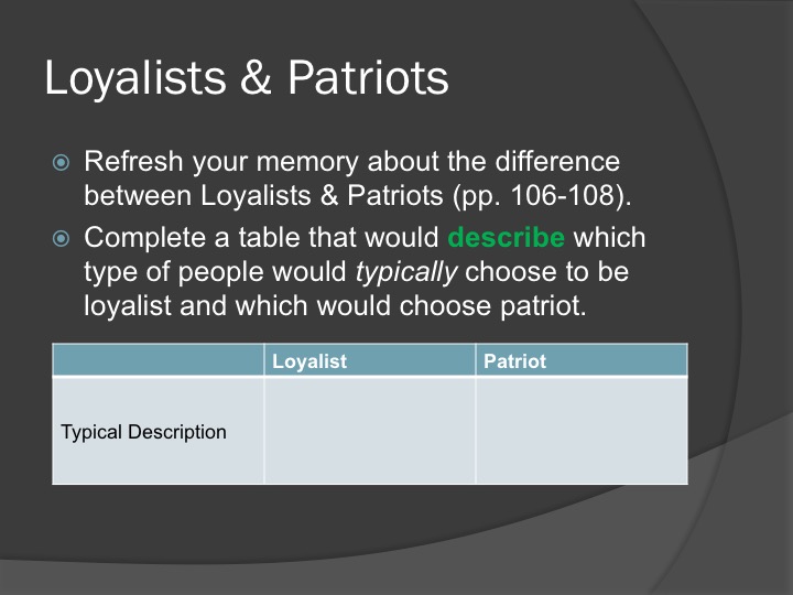 Loyalists & Patriots | 03/03/17 | 03/10/17 | 03/03/17 | 03/10/17 |